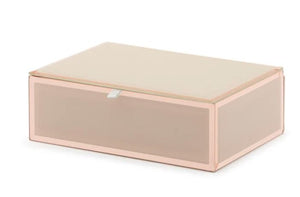 Stash trinkets and treasures galore in this luxurious-looking jewellery box. It's like a jewel itself, crafted from gleaming glass with Art-Deco-inspired bevelled edges and shimmering contrast trim. The classic shape will fit neatly on your vanity table and bring a touch of vintage glamour to your room. Lift the lid to reveal your prettiest possessions resting on a sumptuous black velvet lining. Choosing your accessories has never been such a delight.